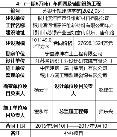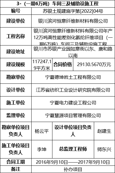 3.4 2022年2月24日,银川恒意取得(一期6万吨)车间四及辅助设施工程的《建筑工程施工许可证》,具体信息如下:
