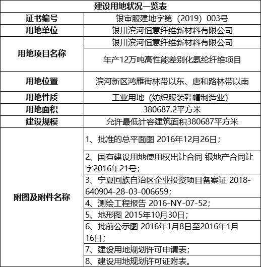 2019年1月8日,银川恒意取得年产12万吨高性能差别化氨纶纤维项目的《建设用地规划许可证》,具体信息如下: