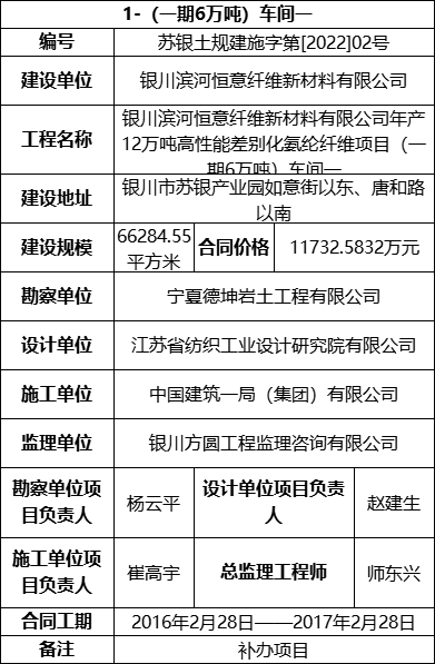 3.1 2022年2月24日,银川恒意取得(一期6万吨)车间一的《建筑工程施工许可证》,具体信息如下: