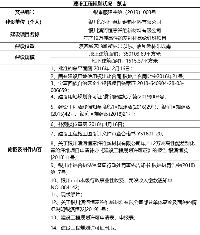 2019年1月8日,银川恒意取得年产12万吨高性能差别化氨纶纤维项目的《建设工程规划许可证》,具体信息如下:
