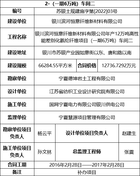 3.2 2022年2月24日,银川恒意取得(一期6万吨)车间二的《建筑工程施工许可证》,具体信息如下: