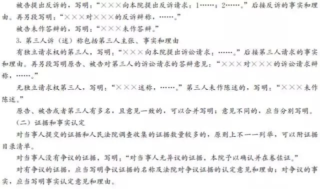 3.诉辩意见不需原文照抄当事人的起诉状或答辩状、代理词内容或起诉、答辩时提供的证据,应当全案考虑当事人在法庭上的诉辩意见和提供的证据综合表述。