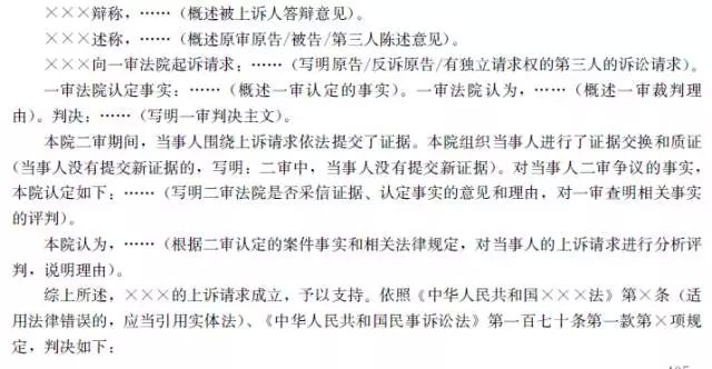 二审案件先写明当事人的上诉请求等诉辩意见。然后再概述一审当事人的诉讼请求,人民法院认定的事实、裁判理由、裁判结果。