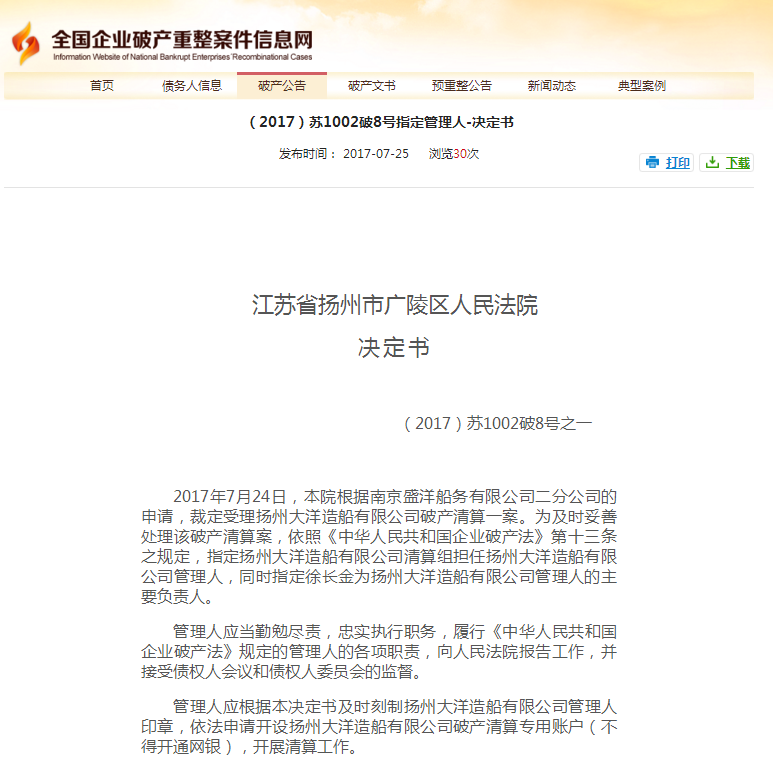 大洋造船难逃倒闭的厄运,进入破产清算程序