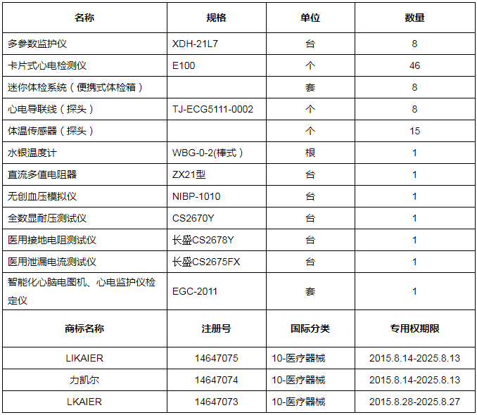 1.拍卖标的为山东力凯尔医疗器械有限公司(下称力凯尔公司)多参数监护仪、卡片式心电检测仪、体温传感器、商标等资产,总计评估清算价值总额为¥67,622.50元。(详见附件《资产清单》,标的移交时,实物与资产清单所列内容不符的,以标的移交时的实际状况为准,如有差异,成交价款不变)